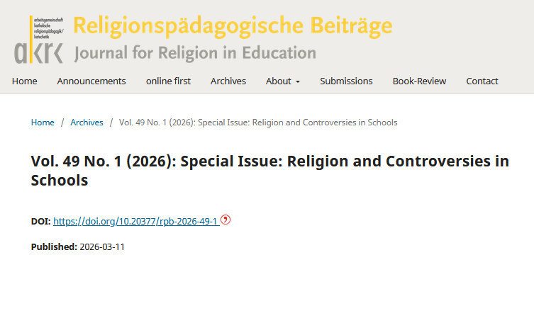 - Herbst, Jan-Hendrik, & Zulaica y Mugica, Miguel. (Hrsg.). (2026). Introduction: Religion and Controversies in Schools. Special Issue. Religionspädagogische Beiträge, 49(1), 1–5. https://doi.org/10.20377/rpb-2000.